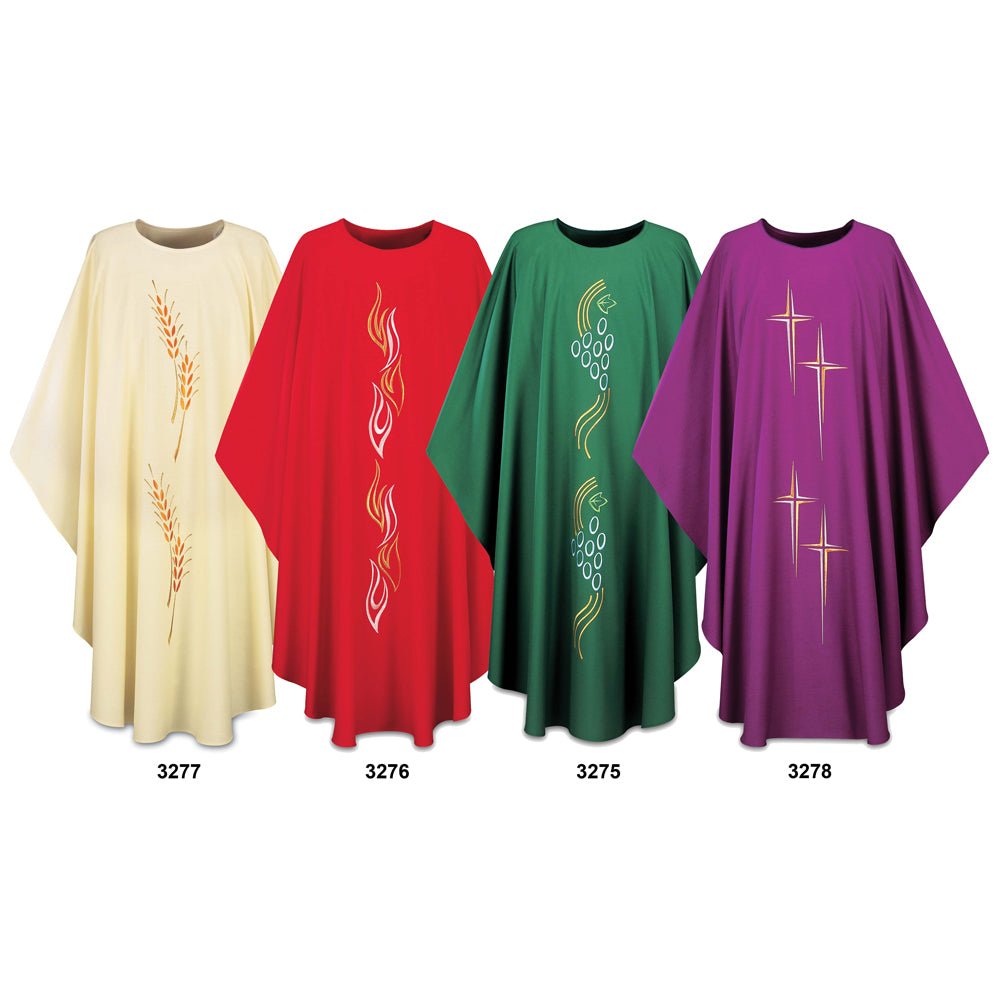 Chasubles in Pascal (99% viscose, 1% gold thread) fabric with embroidered motifs, as illustrated, on front and back in gold and wool threads. Each complete with chasuble stole. With roll collar 4.