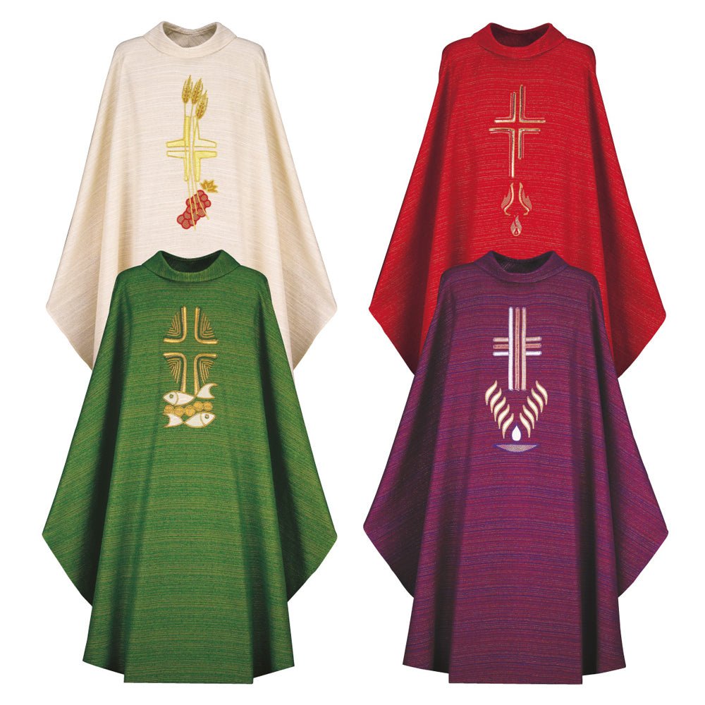 Chasubles in Dupion fabric with appliqué decoration in gold and wool embroidery.