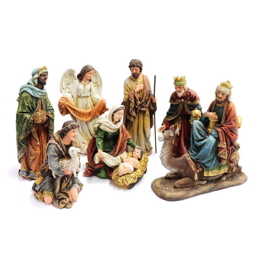 Set includes Our Lady Mary, St Joseph, Infant Jesus, Crib, King Melchior, King Balthazar, King Gaspar, young shepherd, old shepherd, shepherdess and shepherd boy.