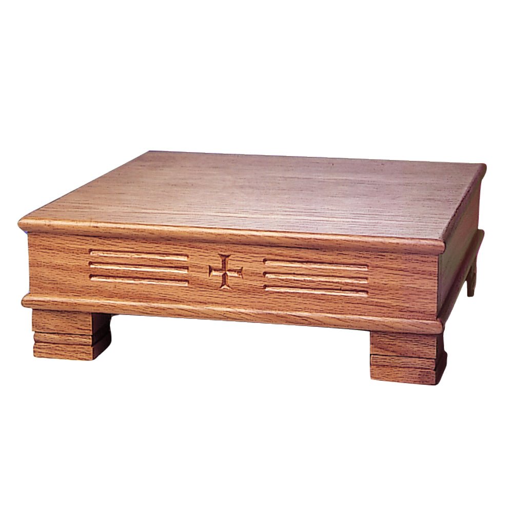 Oak priedieu with built-in bookshelf. Hinged kneeler.