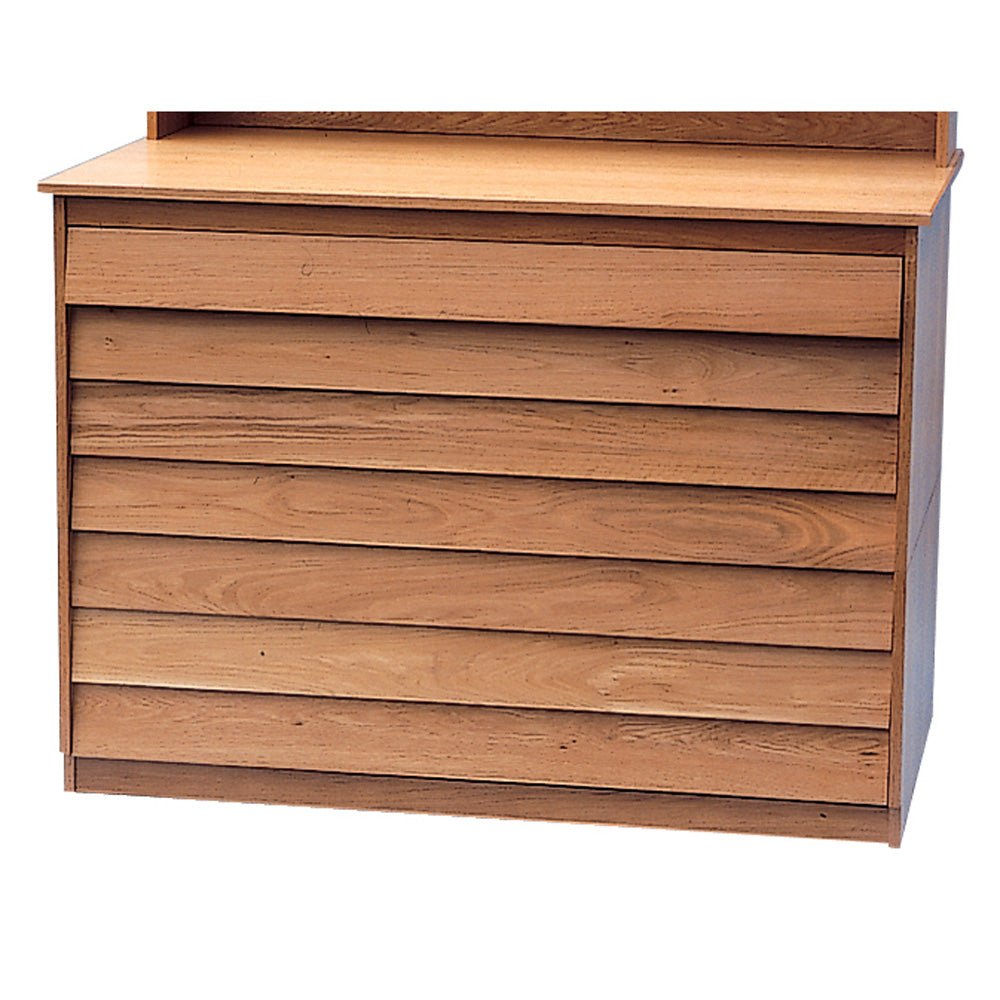 Oak table font with lift-out stainless steel bowl (13.1/2" dia.) and decorated panels.