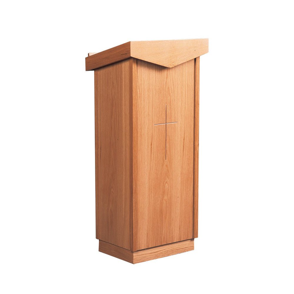 Veneered oak pulpit with solid plinth and adjustable book rest, fitted interior shelf, pointed-front design and incised cross decoration.