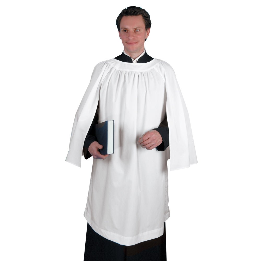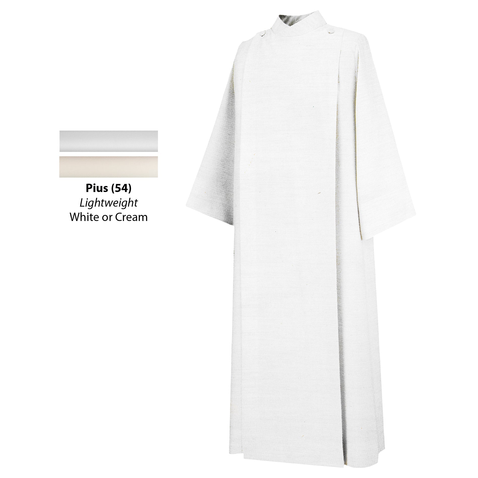 Coat style alb in washable cream Elias fabric (100% man made fibres) with button fastening on each shoulder. Made by Slabbinck.