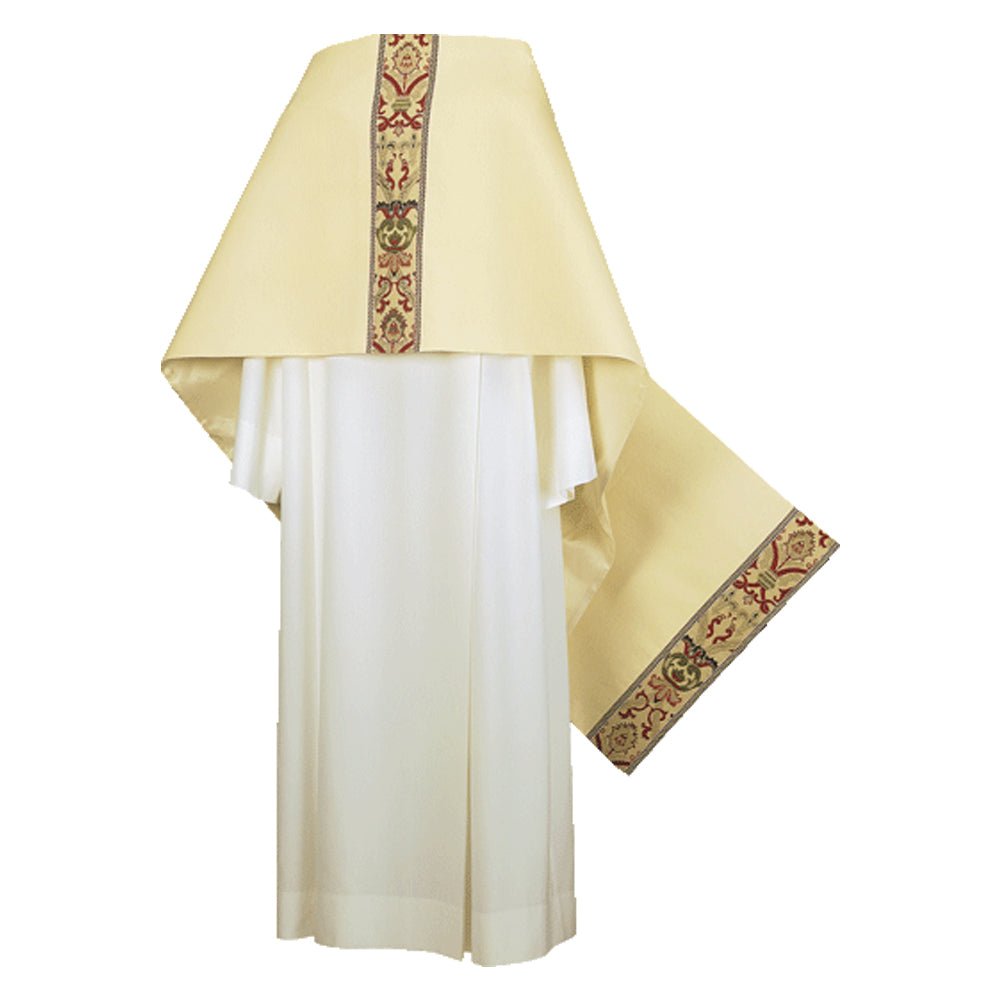 Dalmatic in Elias fabric, decorated with orphrey banding on sleeves, with inside stole. Unlined. 100% man-made fibres. Plain 'O' neck. Made by Slabbinck.