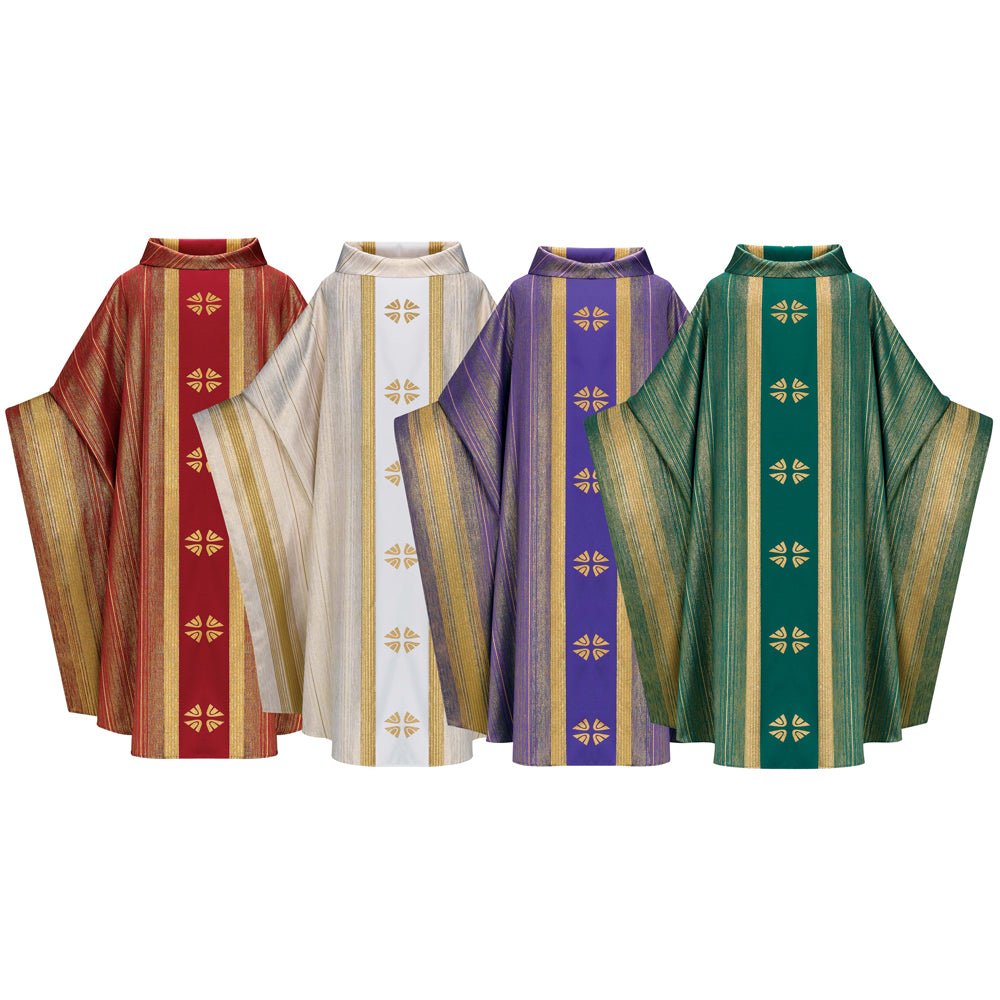 Chasubles in Brugia Fabric (100% wool) with banding and collar in elegant damask edged with gold braid and with a hand embroidered cross. Unlined. Plain 'O' neck. Complete with chasuble stole.