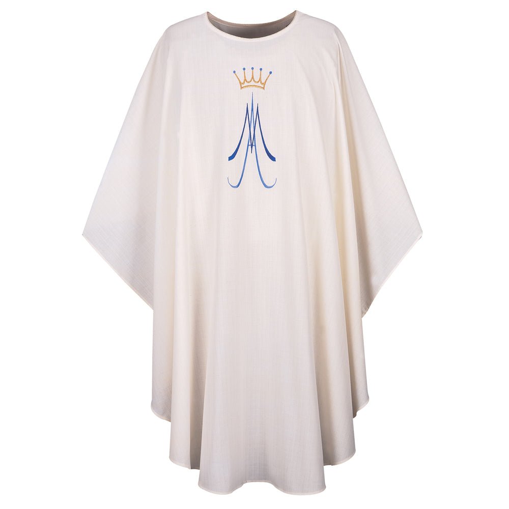 Chasubles in washable Dupion fabric decorated with elegant embroidery in coloured and gold threads. Complete with chasuble stole. Unlined. Plain 'O' neck. Made by Slabbinck.