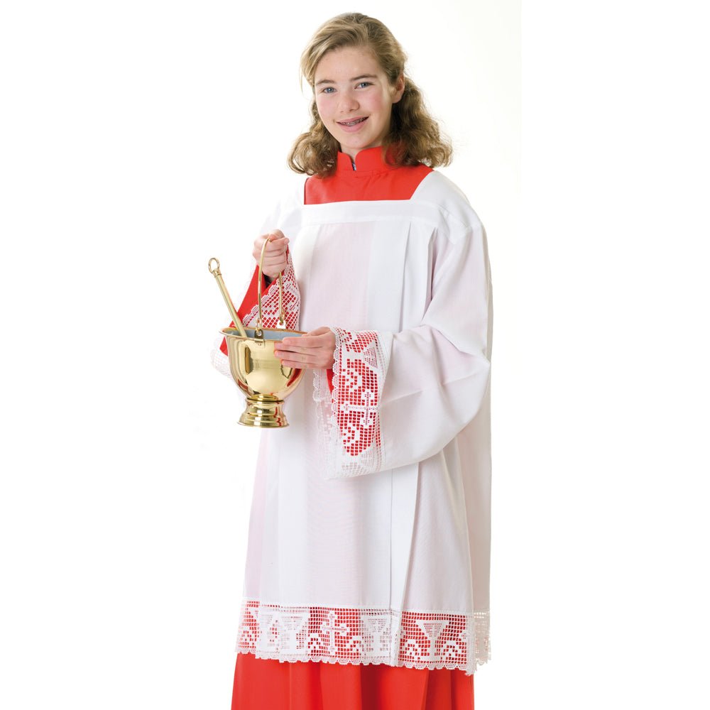 Elegant interchangeable superfrontal in Omega fabric with Pentecost flame motifs. Easy to attach with velcro ('positive' velcro attached to an altarcloth and 'negative' section attached to superfrontal). For suitable altarcloth see 63-51 (extra). Made by Slabbinck.