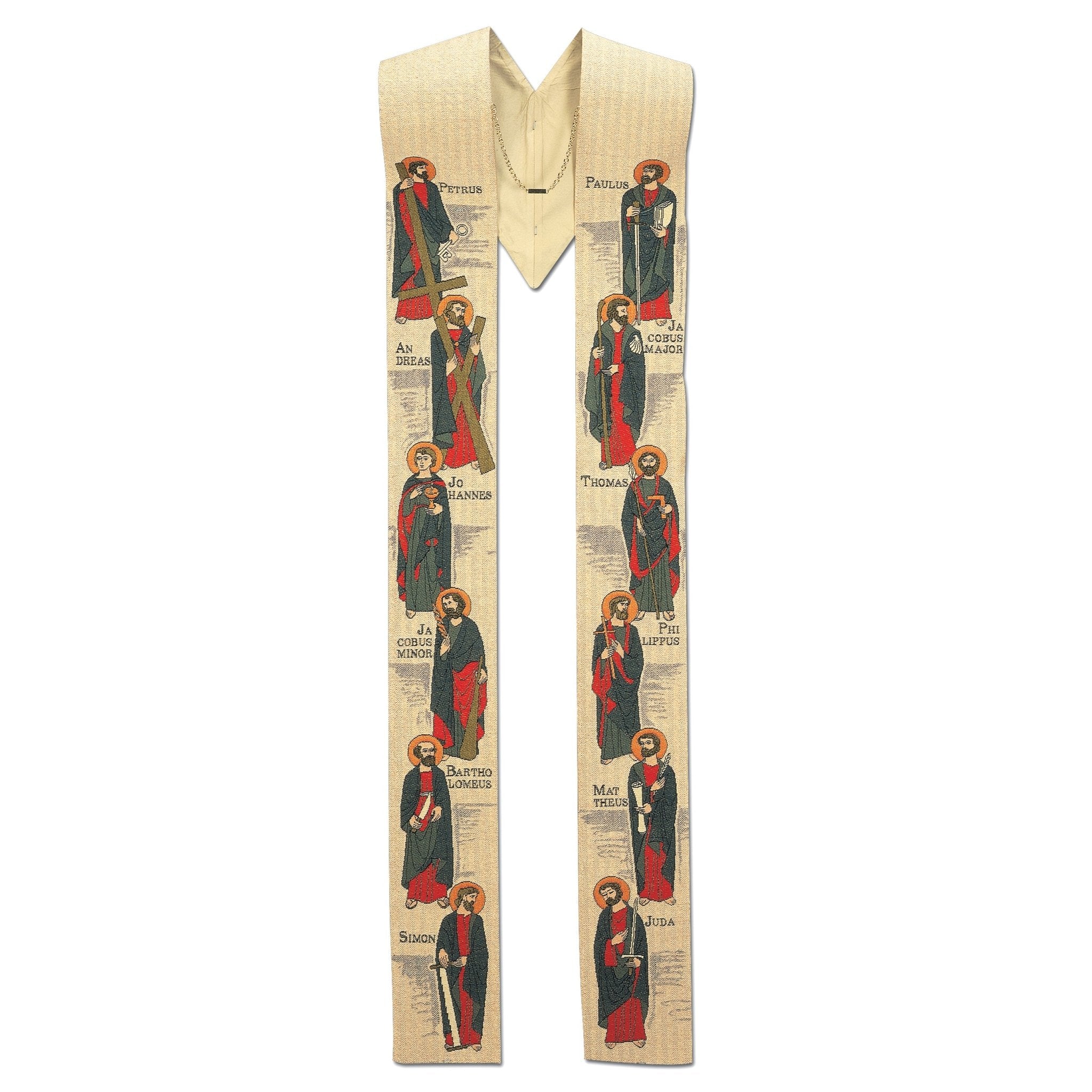 Stoles in Regina multi-coloured brocade trimmed with multi-coloured fringe. Made by Slabbinck.