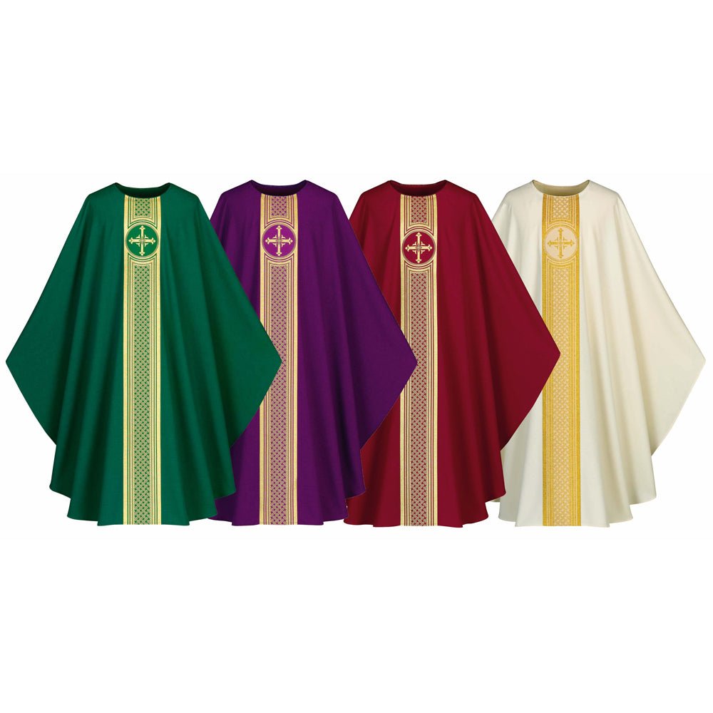 Chasuble in Dupion fabric with banding front and back depicting the Twelve Apostles. Unlined. Complete with chasuble stole. Made by Slabbinck.