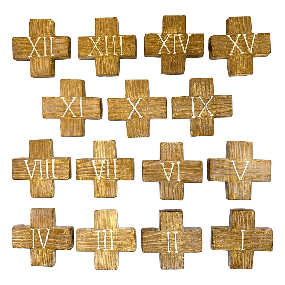 Cast polyester Stations cross set with carved roman numerals and finished in a range of styles.